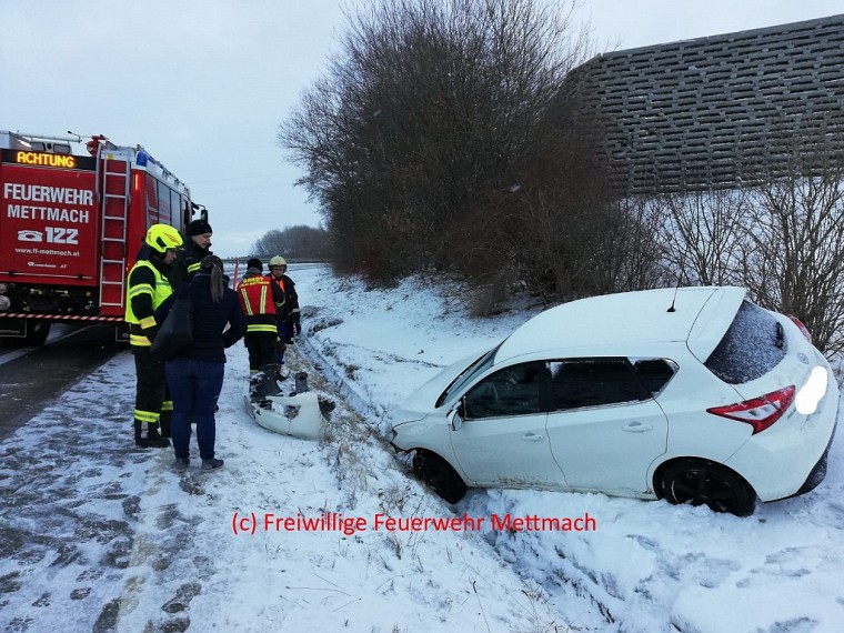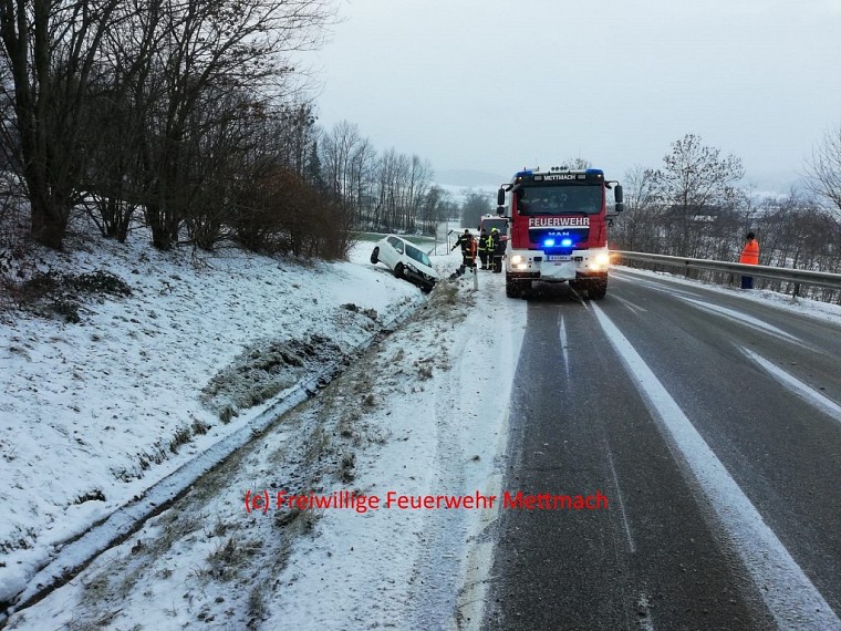 Beim Eintreffen am Einsatzort wurde ein verunfallter Pkw vorgefunden welcher vermutlich aufgrund der Winterlichen Fahrverhältnisse von der Fahrbahn abgekommen war.