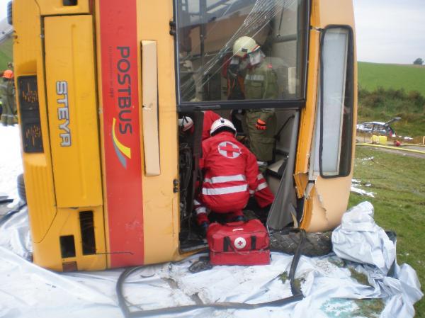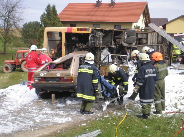 Die FF Metmmach rückte um 14:08 Uhr mit LFB Fahrzeug und 9 Mann zur Übungsstelle aus. Unsere Aufgabe war die Rettung von 4 Verletzen Personen aus 2 Fahrzeugen die in den Busunfall verwickelt waren mittels Hydraulischem Rettungsgerät. Weiters waren die FF Aspach, FF Migelsbach, FF St.Veit, ein Großaufgebot von Sanitätern aus Linz mit 8 Rettungsfahrzeugen und die Suchhundestaffel VoestAlpine vor Ort. Nach der Übungsbesprechung rückten wir um 18:00 Uhr wieder ins Zeughaus ein.