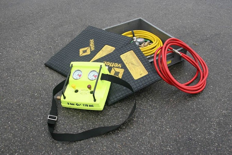Der Hebekissensatz besteht aus einem Doppelsteuerorgan, Luftschläuchen und einem Anschlussstück für Pressluftflaschen sowie 2 Hebekissen Vetter V12 und V32. .