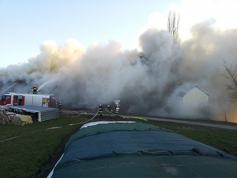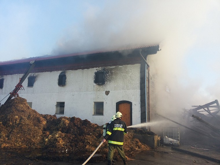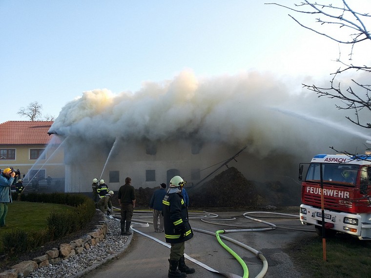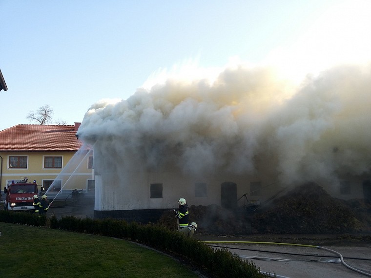 Am Nachmittag des 24.Februar wurden wir gemeinsam mit den Feuerwehren Arnberg, Neundling und Großweiffendorf zum Brand eines landwirtschaftlichen Gebäudes in Katzenberg 2 alarmiert. Da von weitem eine gewaltige Rauchsäule zu sehen war wurde noch während der anfahrt zum Einsatzort von der Landeswarnzentrale Alarmstufe 2 ausglöst. Beim Eintreffen am Einsatzort stand der Stadel bereits in Vollbrand, der Dachstuhl des angrenzenden Rinderstalles stand ebenfalls in Brand. Es wurde unverzüglich mit der Brandbekämpfung begonnen, das Löschwasser wurde zunächst aus einem ca. 150m entfernten Löschteich (Inhalt 150m³) mit 2 Zubringerleitungen befördert, wodurch die Wasserversorgung der Tanklöschfahrzeuge schnell gesichert war.In weiterer folge wurden von den nachkommenden Feuerwehren noch Zubringerleitungen von der Mettmacher Ache errichtet. Aufgrund der Starken Rauchentwicklung wurde mit der evakuierung der im Stall befindlichen Rinder begonnen, was jedoch nach kurzer Zeit wieder abgebrochen wurde, da die Gefahr bestand das die Decke einstürzen könnte. Stattdessen wurden vor dem Stall Hochleistungslüfter in stellung gebracht und damit der Stall belüftet. Für 4 Kalbinen die im Stadel untergebracht waren gab es allerdings keine Rettung mehr, sie verendeten im Feuer. 16 Maststiere wurden noch am selben Tag zur Notschlachtung abgeholt. Die rund 20 Milchkühe blieben unversehrt. Da stellenweise das Löschen nur unter Schwerem Atemschutz möglich war, wurde das Atemschutzfahrzeug der FF Ried alarmiert. Aufgrund der Einsturzgefahr des Stalldachstuhles, und um einen umfassenden Löschangriff sicherzustellen wurde später noch die Drehleiter der FF Ried nachalarmiert. Als sehr mühsam und zeitaufwändig stellte sich später das abräumen des Heustockes heraus, was nur händisch und unter Schwerem Atemschutz möglich war. In der Nacht wurde im "Schichtbetrieb" Brandwache gehalten, wo immer wieder aufflammende Glutnester abgelöscht werden mussten. Tags darauf wurde nach der freigabe der Brandstelle durch das LKA mit der Räumung begonnen. Wir mussten dabei immer wieder nachlöschen, da die nicht verbrannten Heu- und Strohballen beim verladen teilweise wieder Feuer fingen.