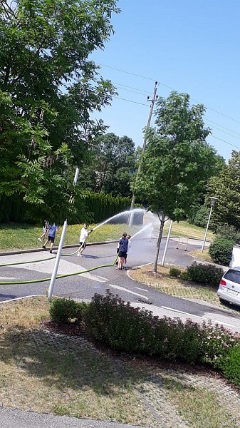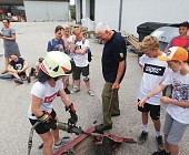Weiter Stationen waren: eine Führung durch das Feuerwehrhaus, eine Löschübung mit unserem Tanklöschfahrzeug wo die Kinder auch selbst Hand anlegen durften, eine Autotür mit der Bergeschere zerschneiden und einen Kübelspritzen Bewerb. Den Abschluss des Vormittages bildete die Fahrt mit den Einsatzfahrzeugen zurück in die Schule!