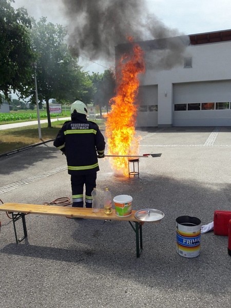Bei einem Stationsbetrieb konnten die Schüler hautnah miterleben, was passiert wenn man einen Fettbrand mit Wasser löscht.